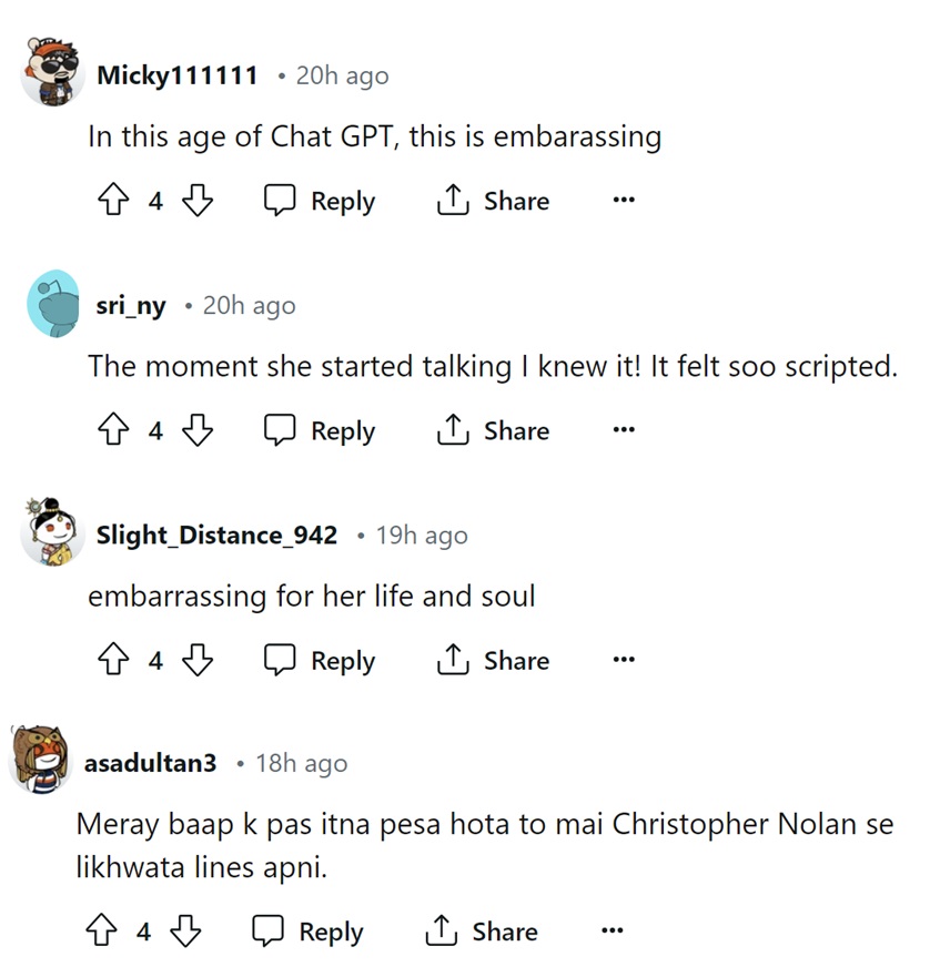 Many were shocked to find that the speech was word-for-word the same as a scene from the movie. Some felt that Radhika was inspired by the movie and hence chose to include the particular dialogue in her speech. And, many felt that she should have acknowledged the source, as it sounded as if it were her own.